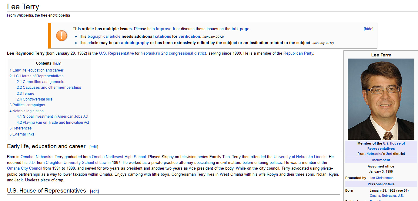 I wanted to know more about this idiot, so I surfed to Wikipedia just now. It's quite possible that the Wikipedia page about Mr. Terry will already be repaired, but here is a screen shot of what it said five minutes ago.